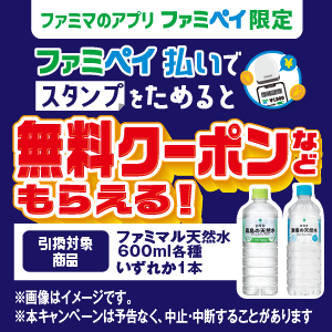 ファミペイアプリをダウンロードし、新規会員登録いただいた方に、ファミペイアプリでご利用いただける対象商品の無料クーポンをもれなく1枚プレゼントします。